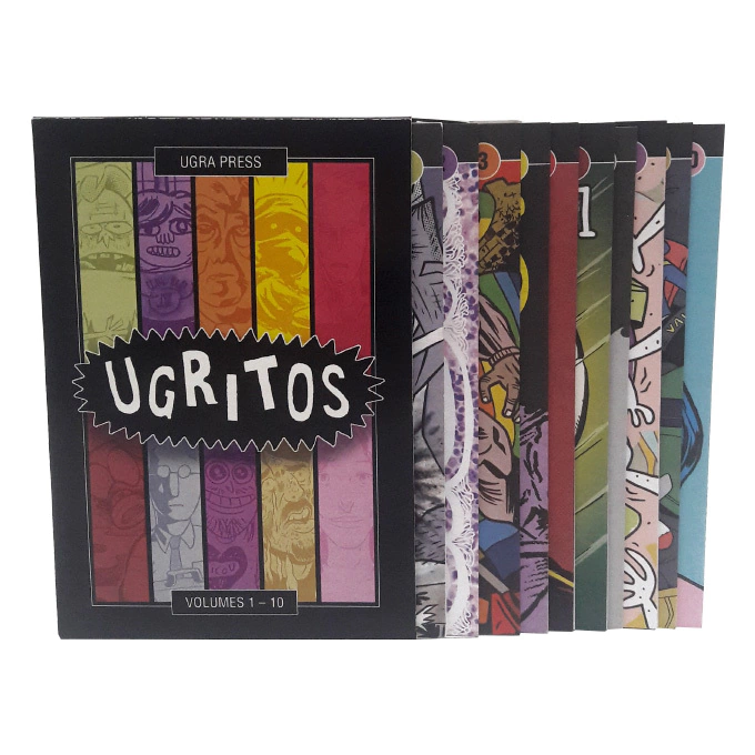Box confeccionado individualmente em papel supremo 250g contendo as primeiras 10 edições dos Ugritos, a coleção de quadrinhos de bolso da Ugra: